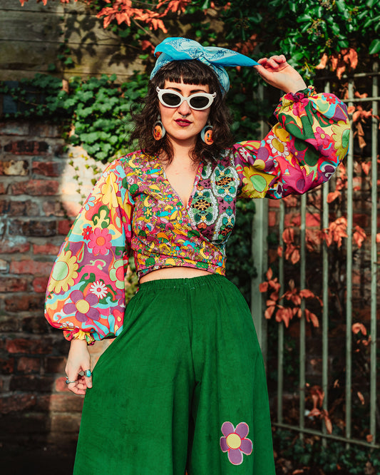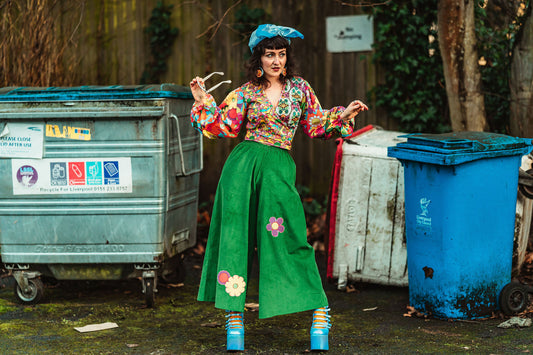 The Recycling Centre Green Cord Flower Wide Leg Trousers