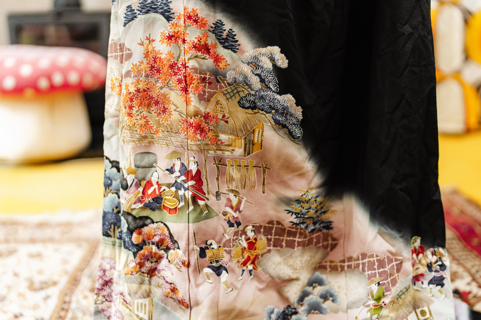 Details: What an absolute dream piece! An absolutely stunning traditional antique kimono, I estimate from China around the 1940s. It has a classic kimono shape, super heavy weight double layered silk with splits on the sleeves and an intricate design on the hem. These kimonos were worn by women of status and were designed to trail on the floor or be tied up with an obi, hence the very long length!