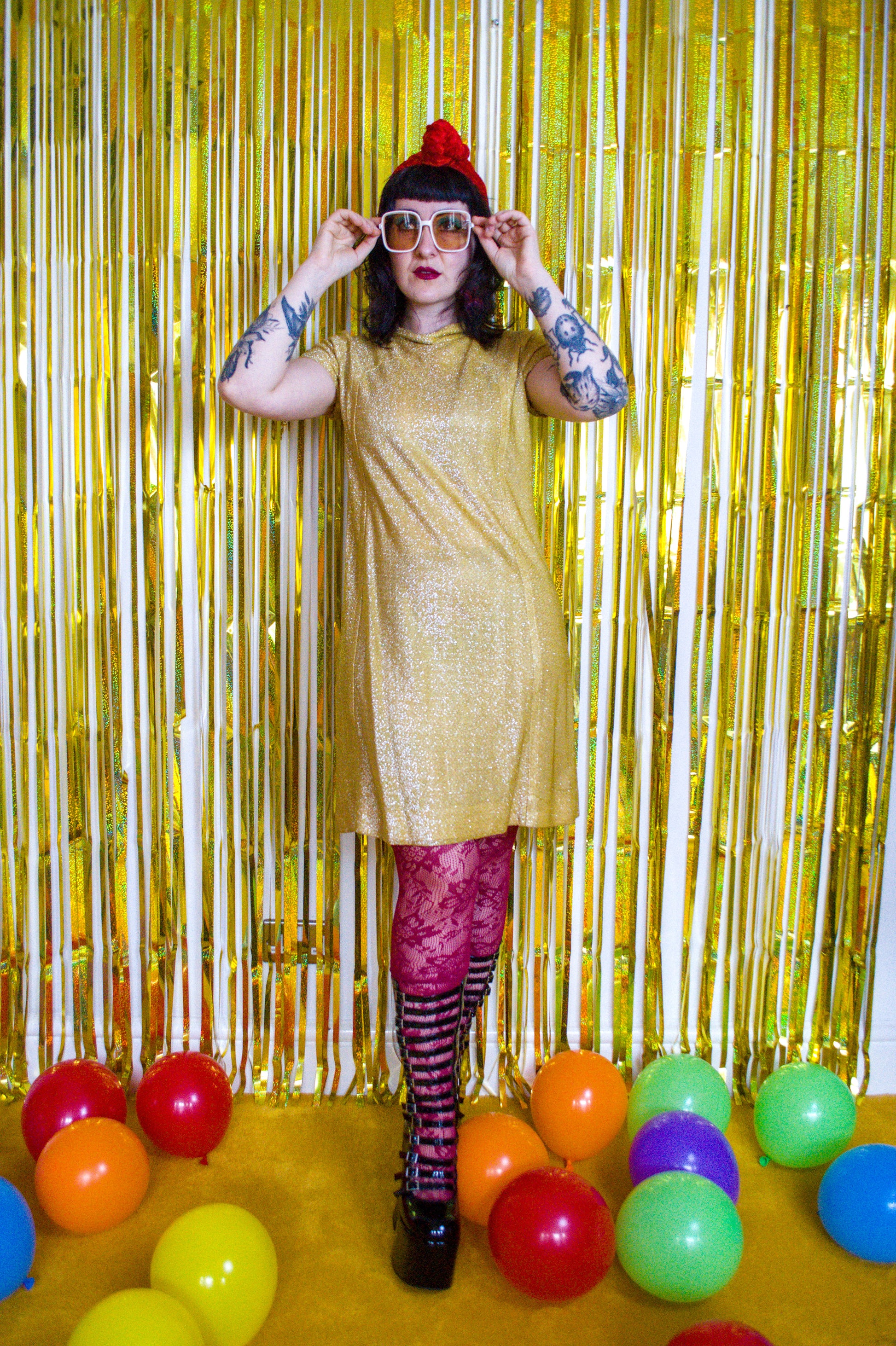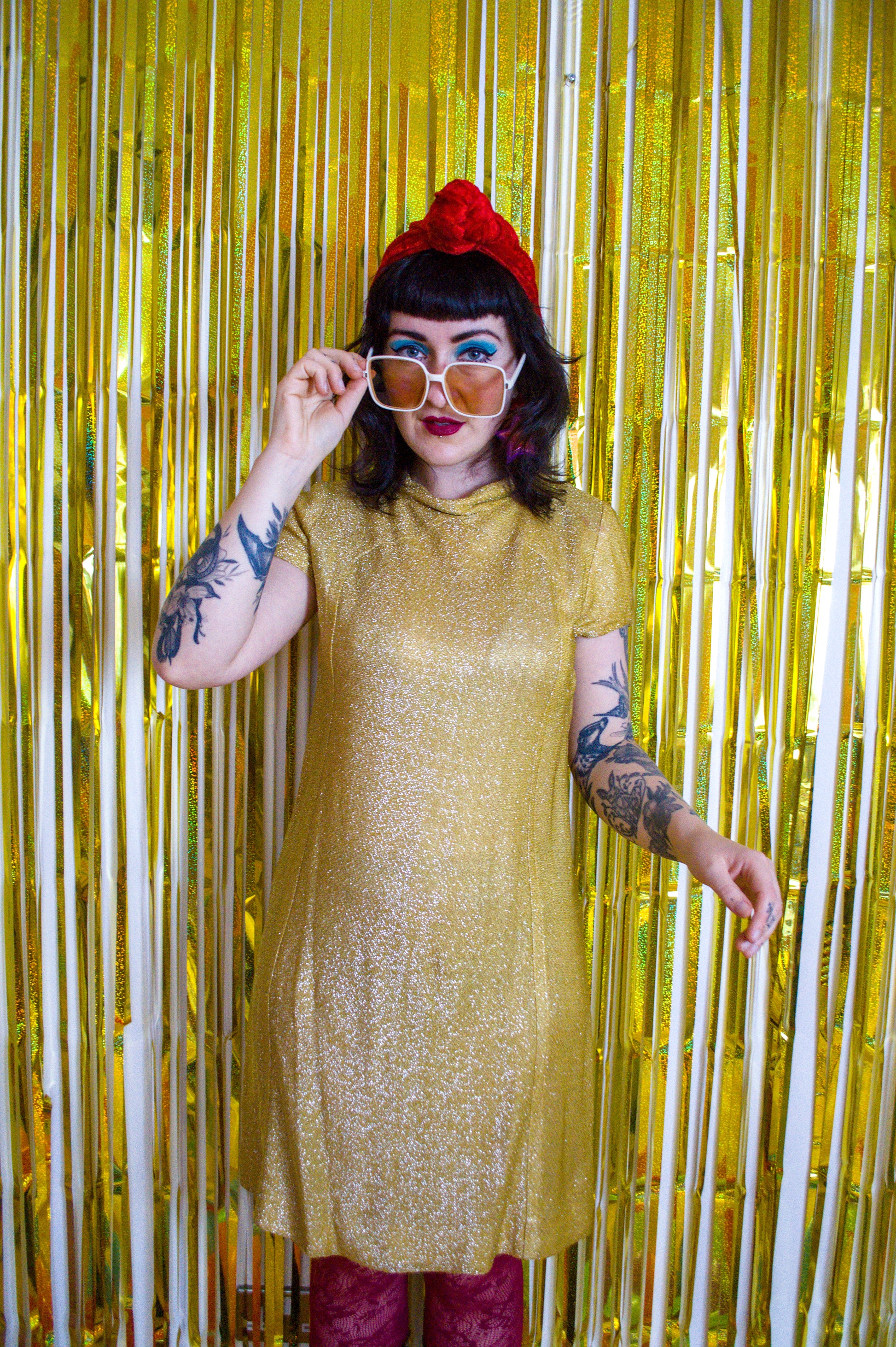 Details: Is there anything more festive than gold lurex?! And is there anything more 60s than a gold lurex shift dress!? Such a gorgeous mini with a classic 60s shape, a high neck and short sleeves, so fun to style with tights and boots or pair with flares for a full vintage look!