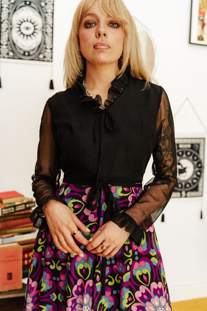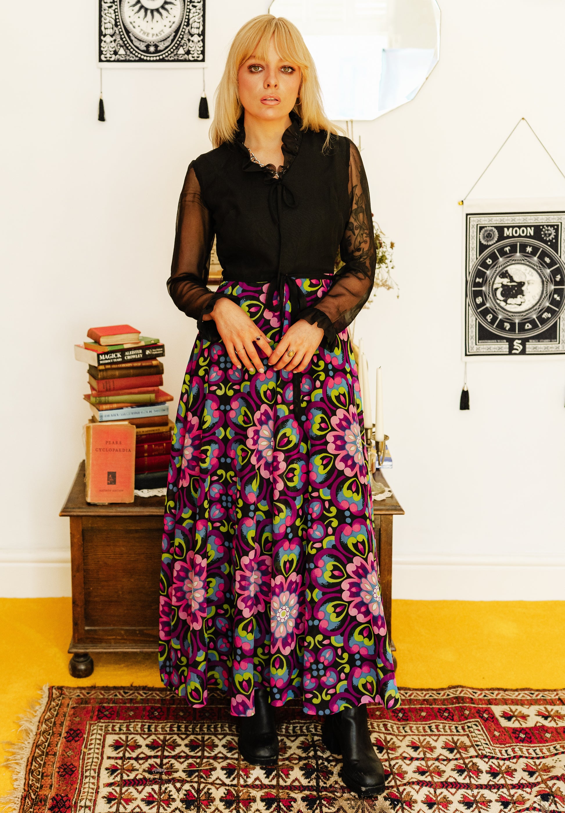 Details: This dress is 70s perfection! With black sheer sleeves and a frilly chest, it features an incredible purple and green psychedelic floral print skirt! Complete with a black tie waist belt for a super flattering fit.