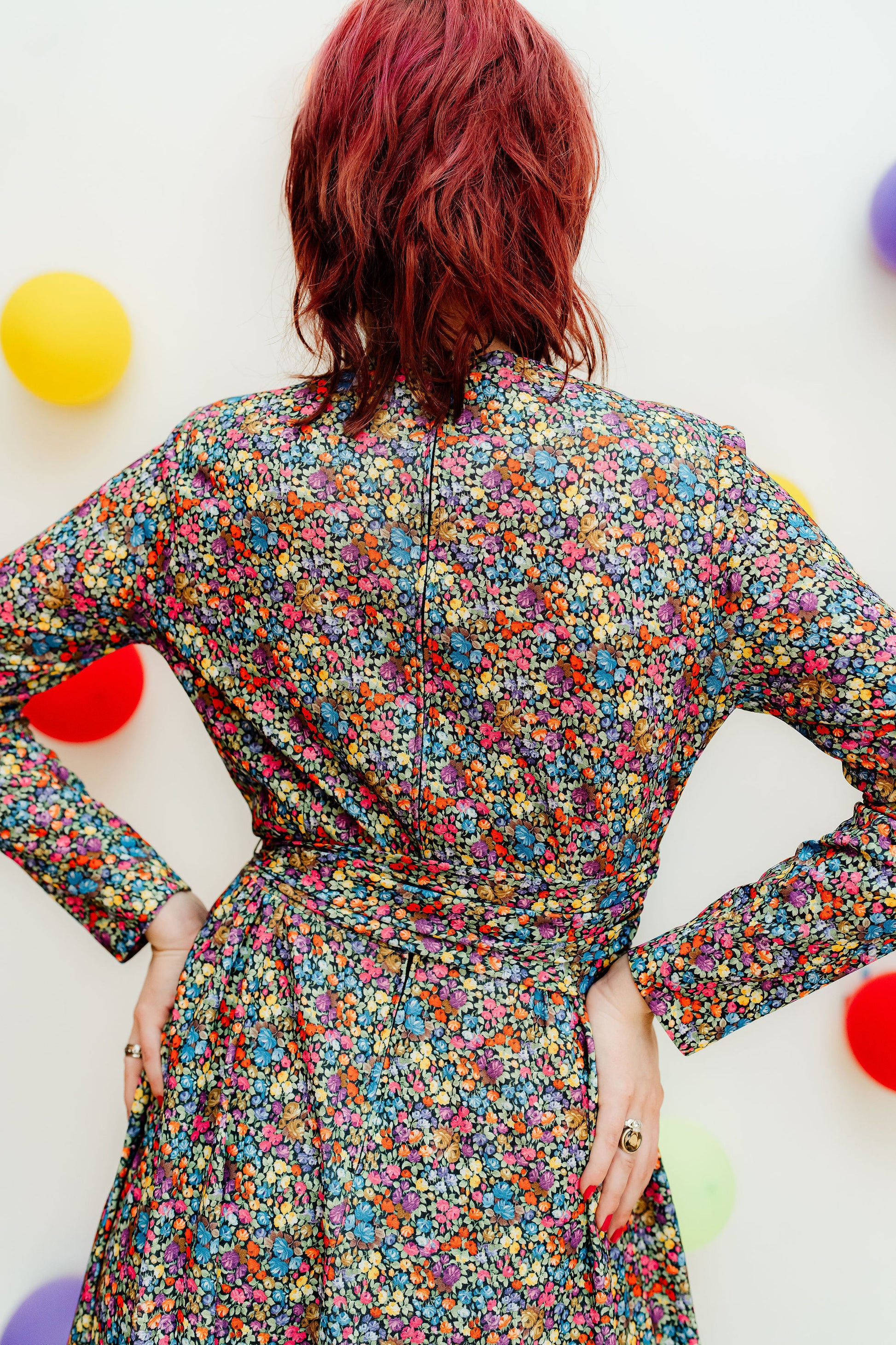 Details: Such a classic tea dress, so feminine and so fun to style! Featuring a super colourful delicate floral print, this dress has a V neck, a cinched waist and pleats at the shoulders.