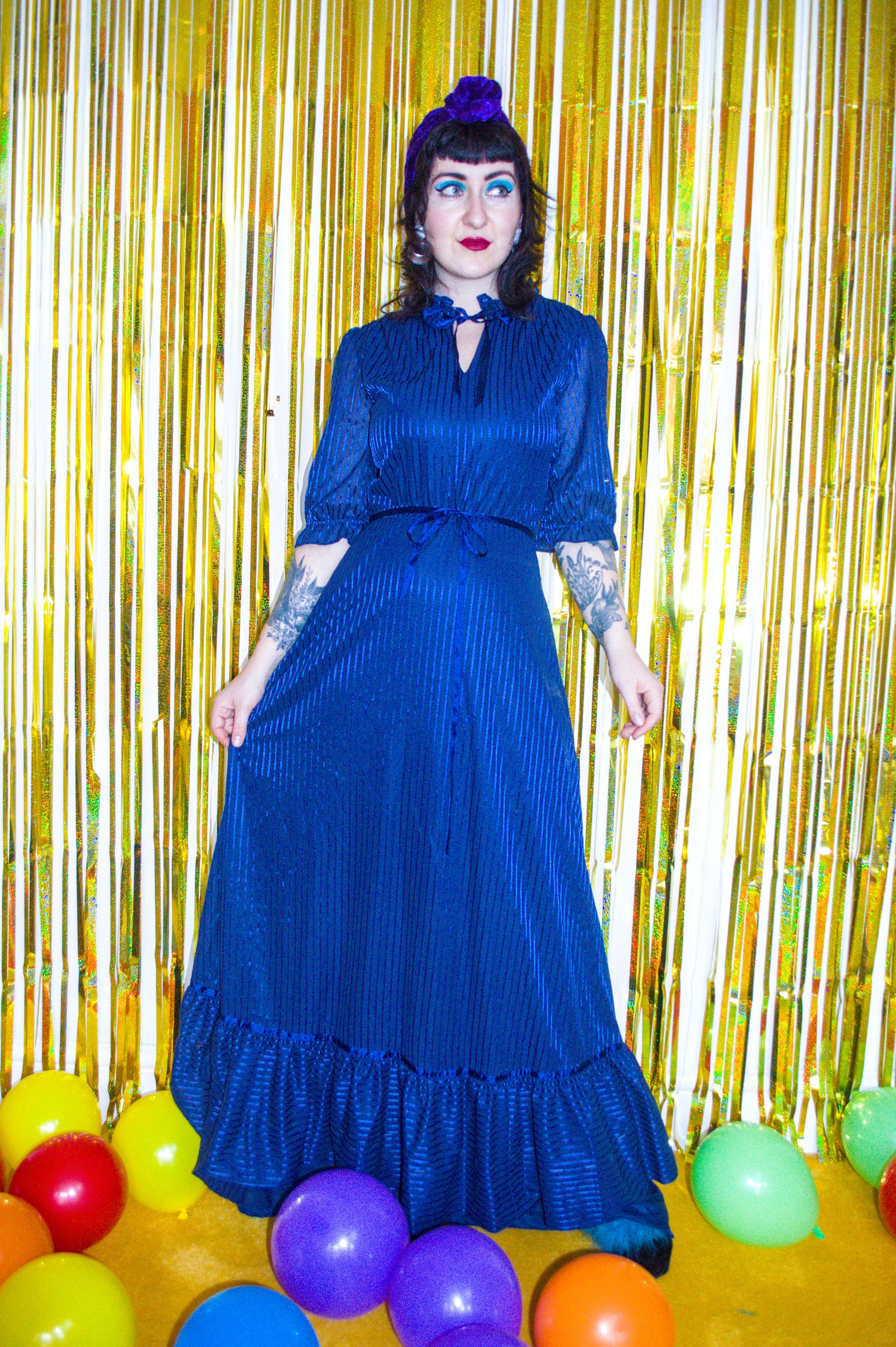 Details: I'm pretty sure every glamorous woman in the 1970s had a dress like this one and I can definitely see why! So easy to throw on for an instant vintage look, and can so easily be dressed up or down. Made from a navy blue stripe effect fabric, this maxi has 3/4 sleeves, a full skirt, an elasticated waist band (so perfect for festive feasts!), a tie at the neck and a matching tie waist belt!