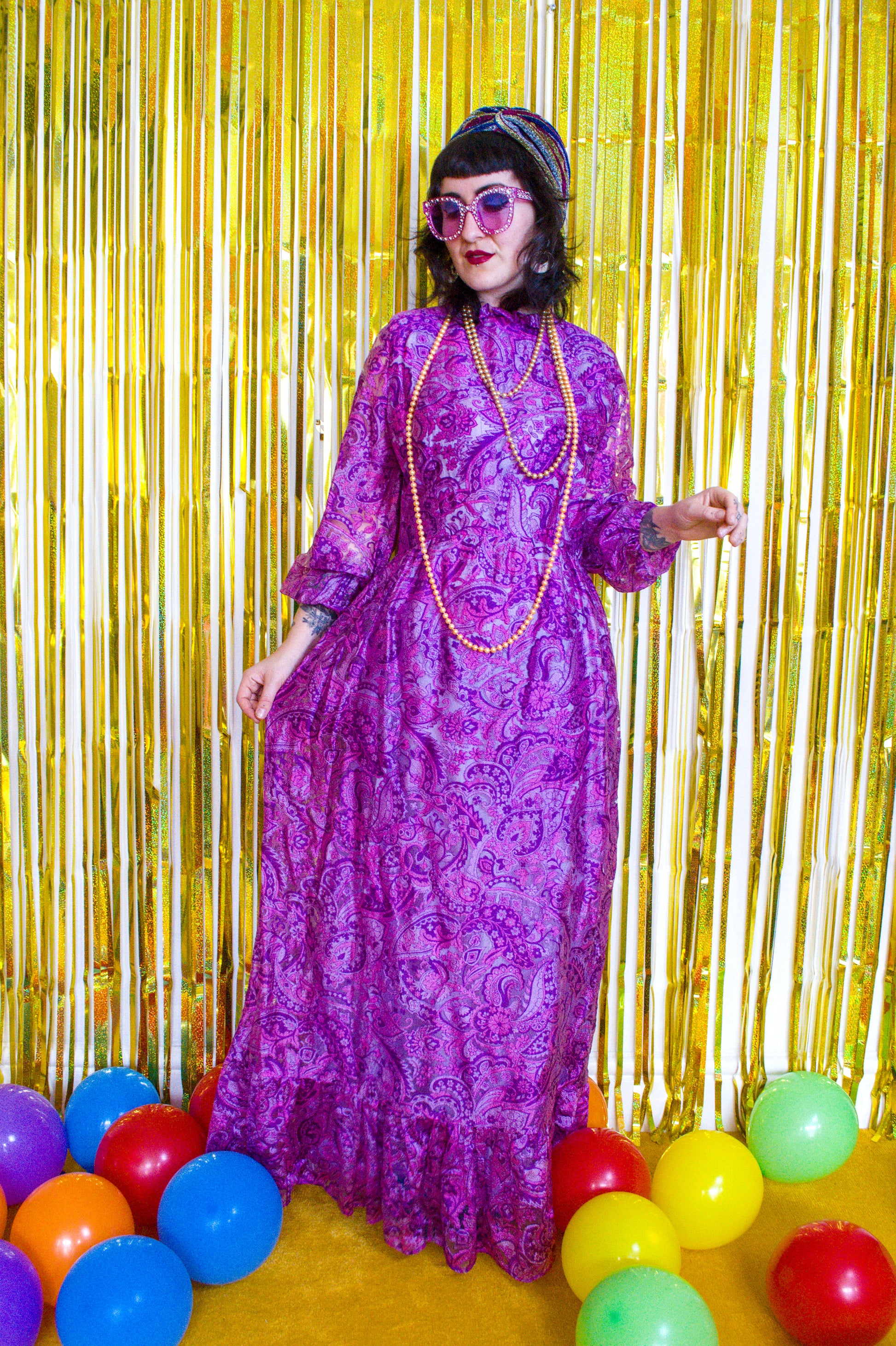 Details: What an absolute dream maxi! Featuring an iconic 60s and 70s paisley in stunning purples and pinks, this dress has a classic 70s shape with a high neck, a frill hem and elasticated cuffs! Fastens with a zip at the back.