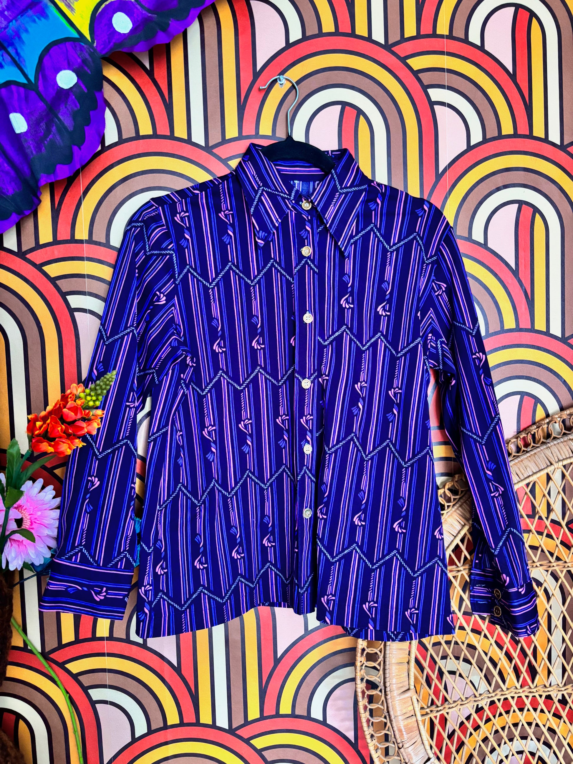 Details: A 70s classic in the best shade of deep purple! With a super 70s geometric stripe print, gold buttons and a classic pointed collar. Layer underneath our Castle Crowley maxi dress or pair with our velvet maxi skirt!