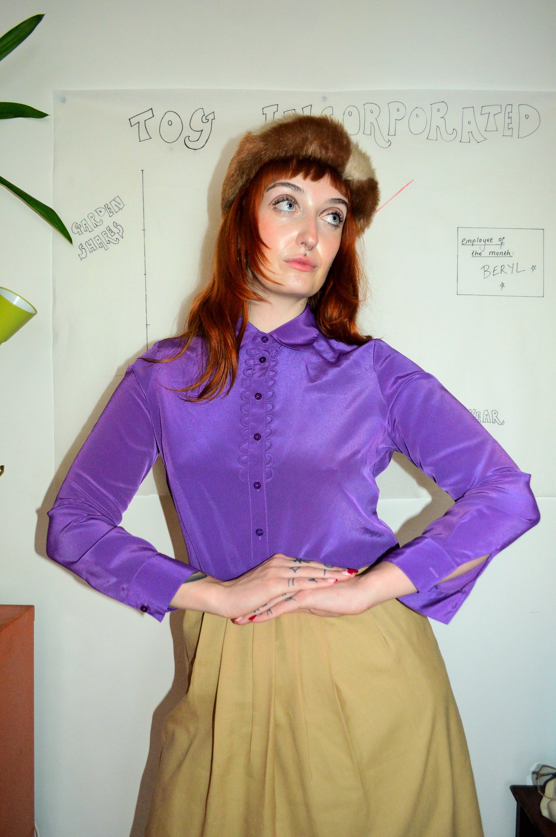 Details: The perfect basic in a gorgeous shade of purple, featuring a peter pan collar and a scallop detail on the chest.