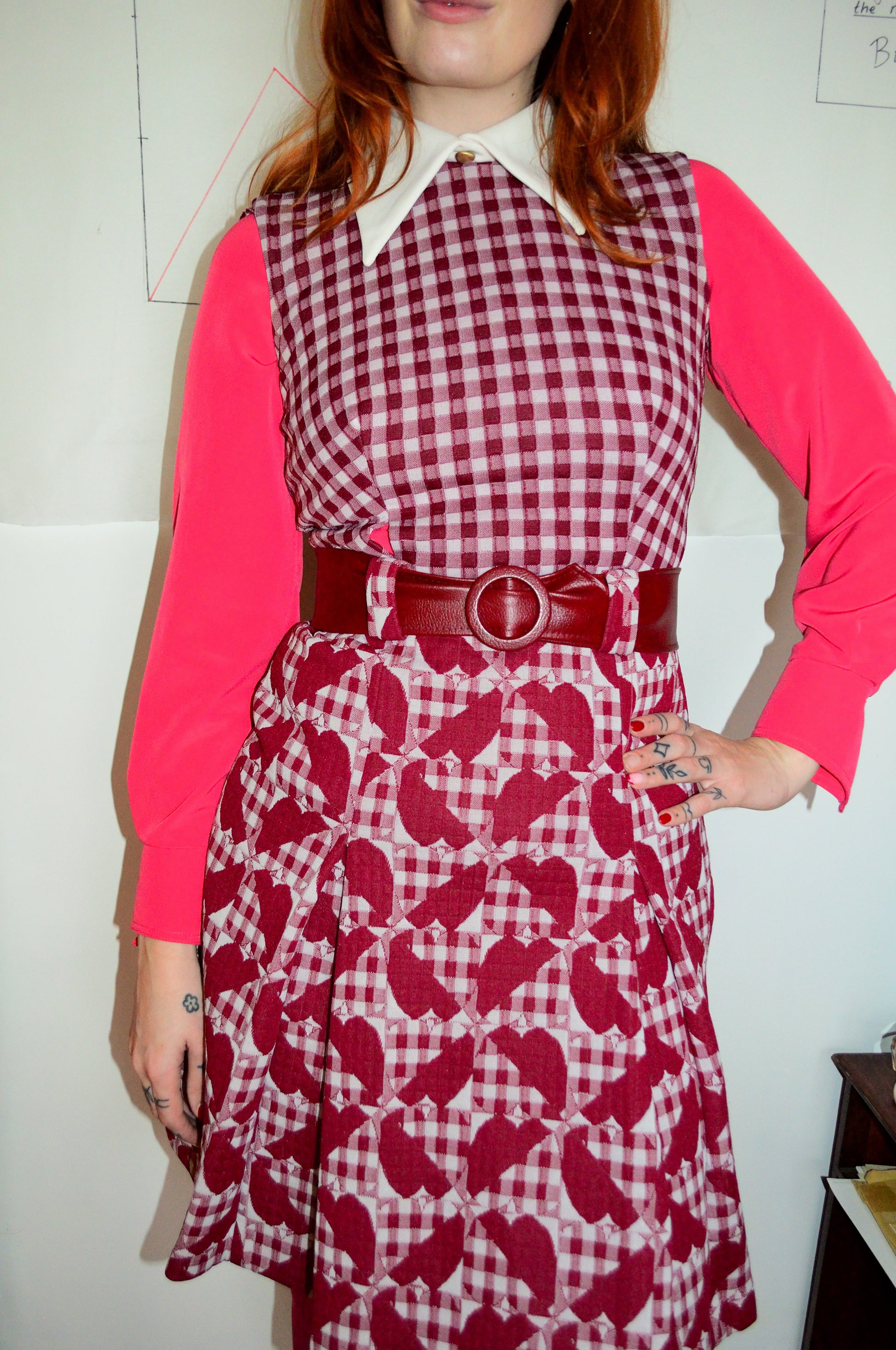 Details: What an adorable 70s dress! Featuring a classic gingham check print, this dress has a contrast white collar, with big belt loops and a faux leather maroon red belt. Shirt sold separately.
