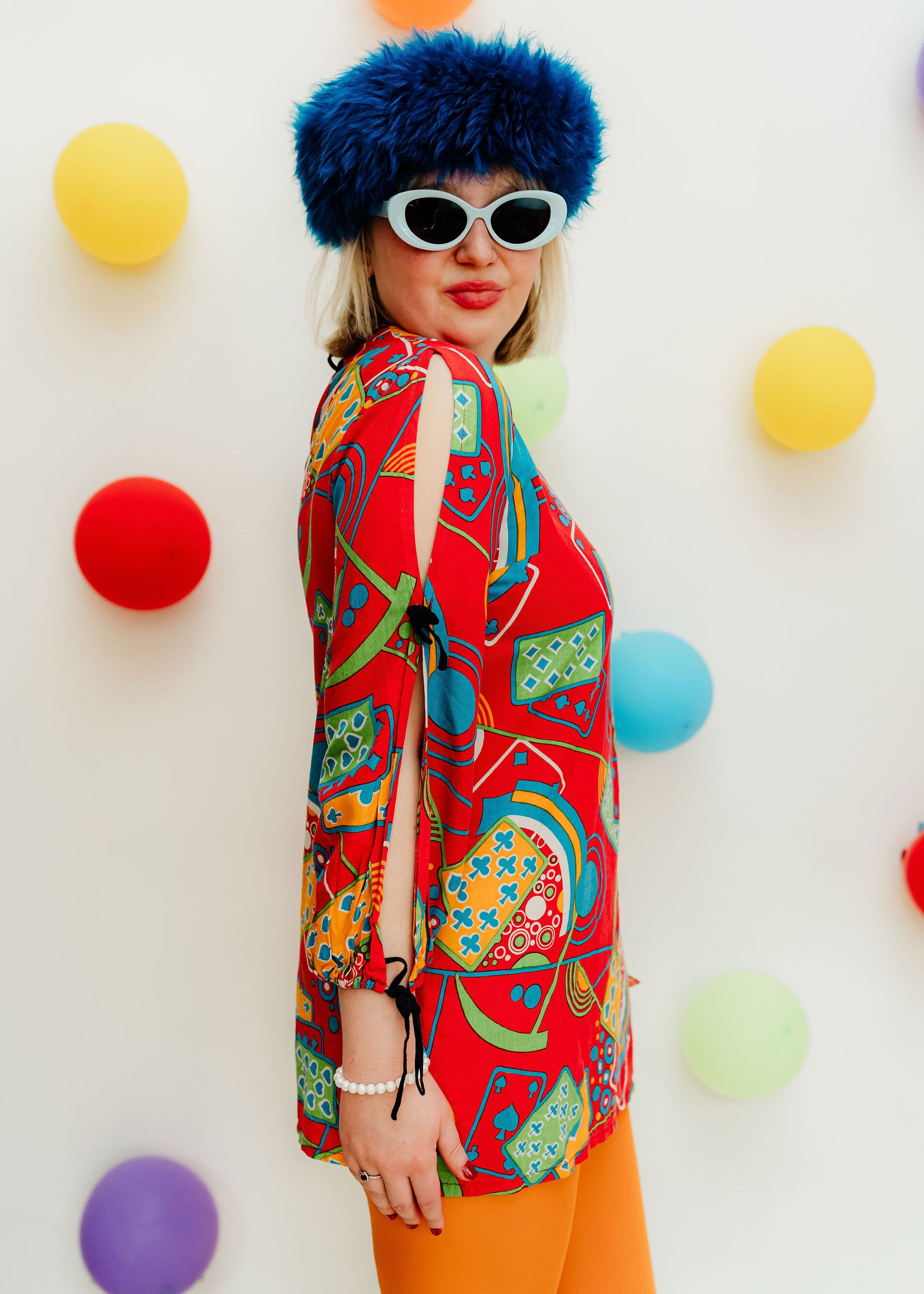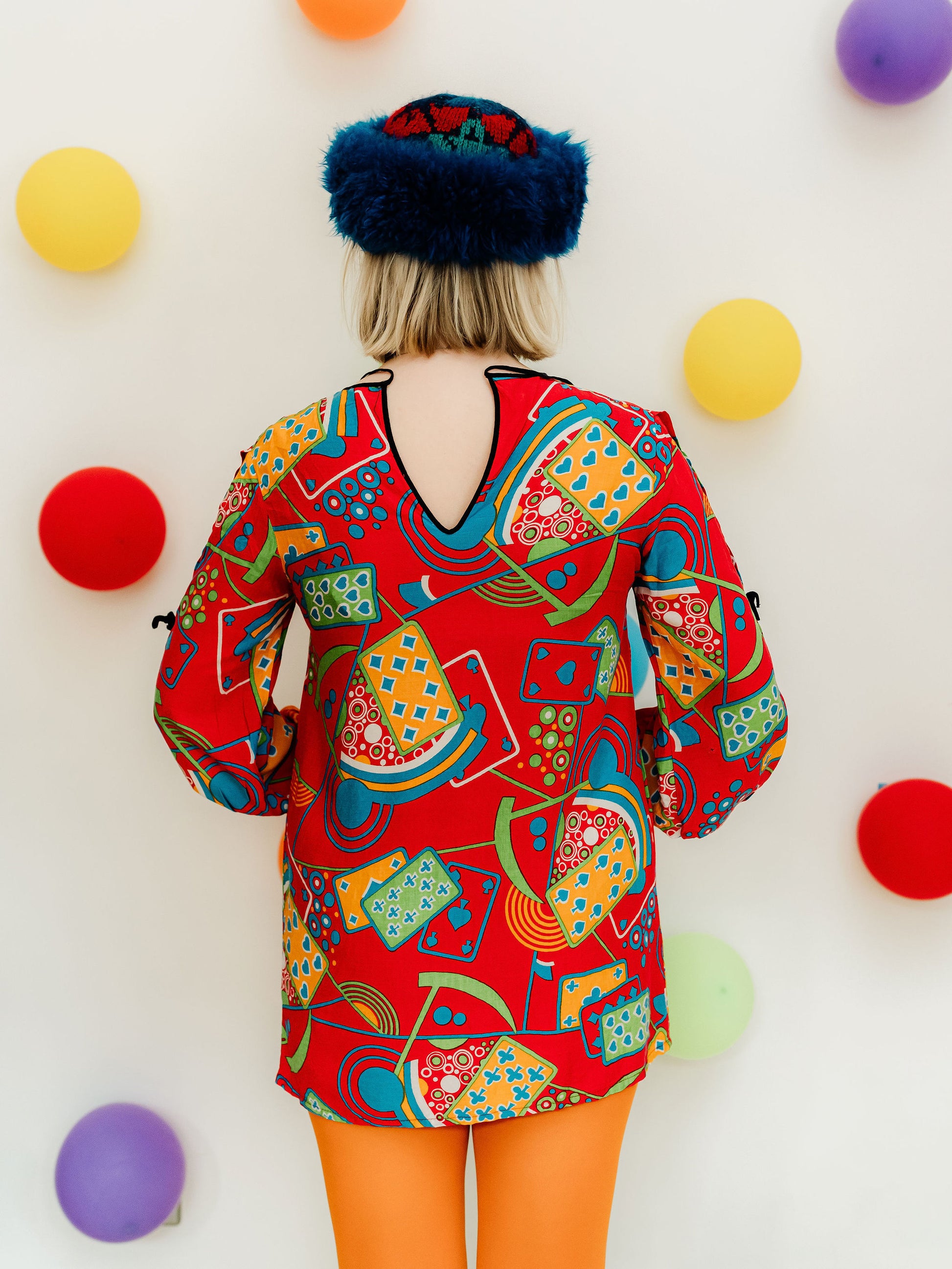 Details: This might be one of the most fun pieces we have ever found! So cute as a mini if you're brave enough, otherwise perfect paired with flares or even some 80s trousers for a full vintage look. Featuring that incredible colourful playing card motif print, this top fastens with a black tie at the back of the neck, and has split arms that tie together too!