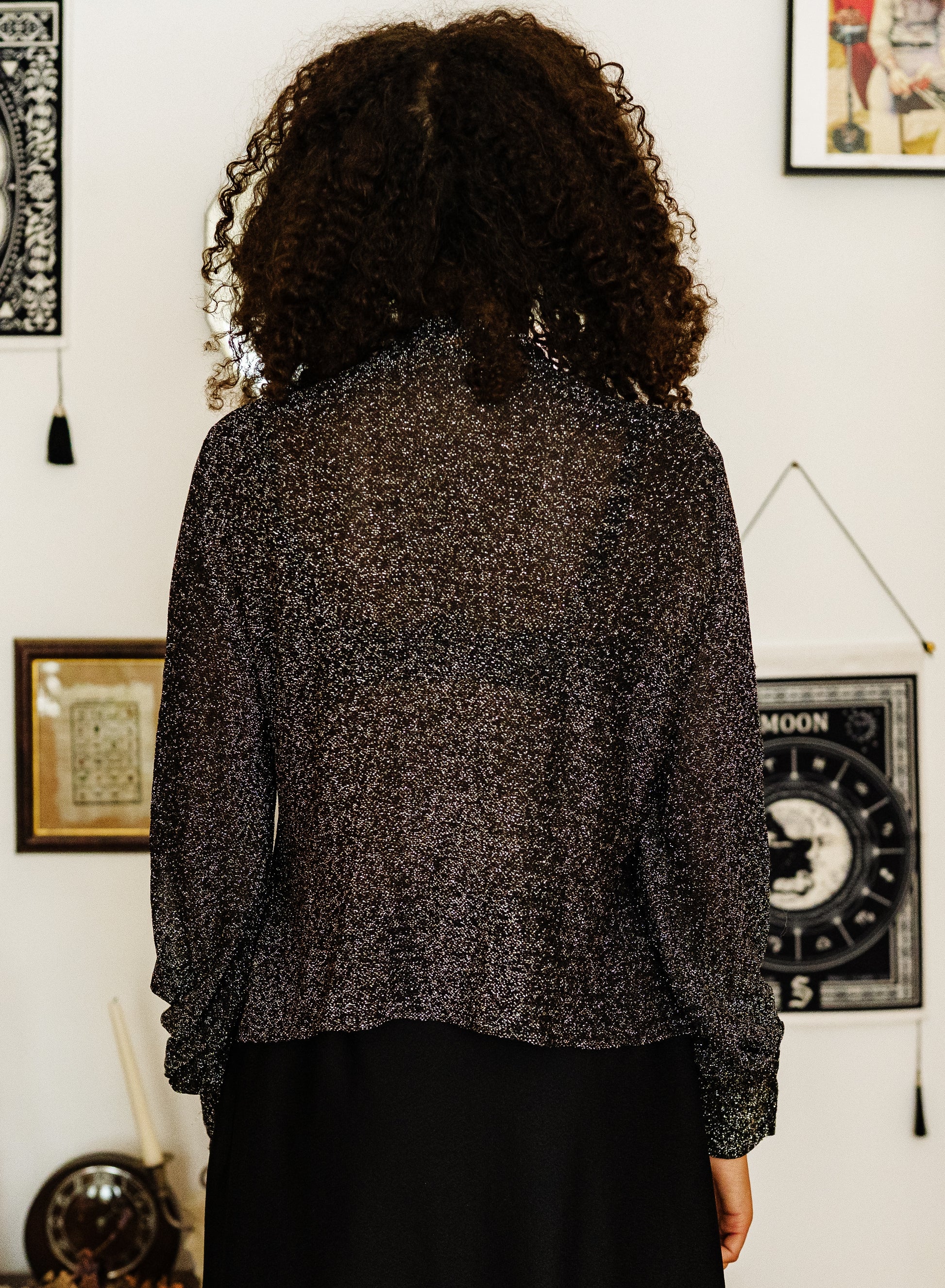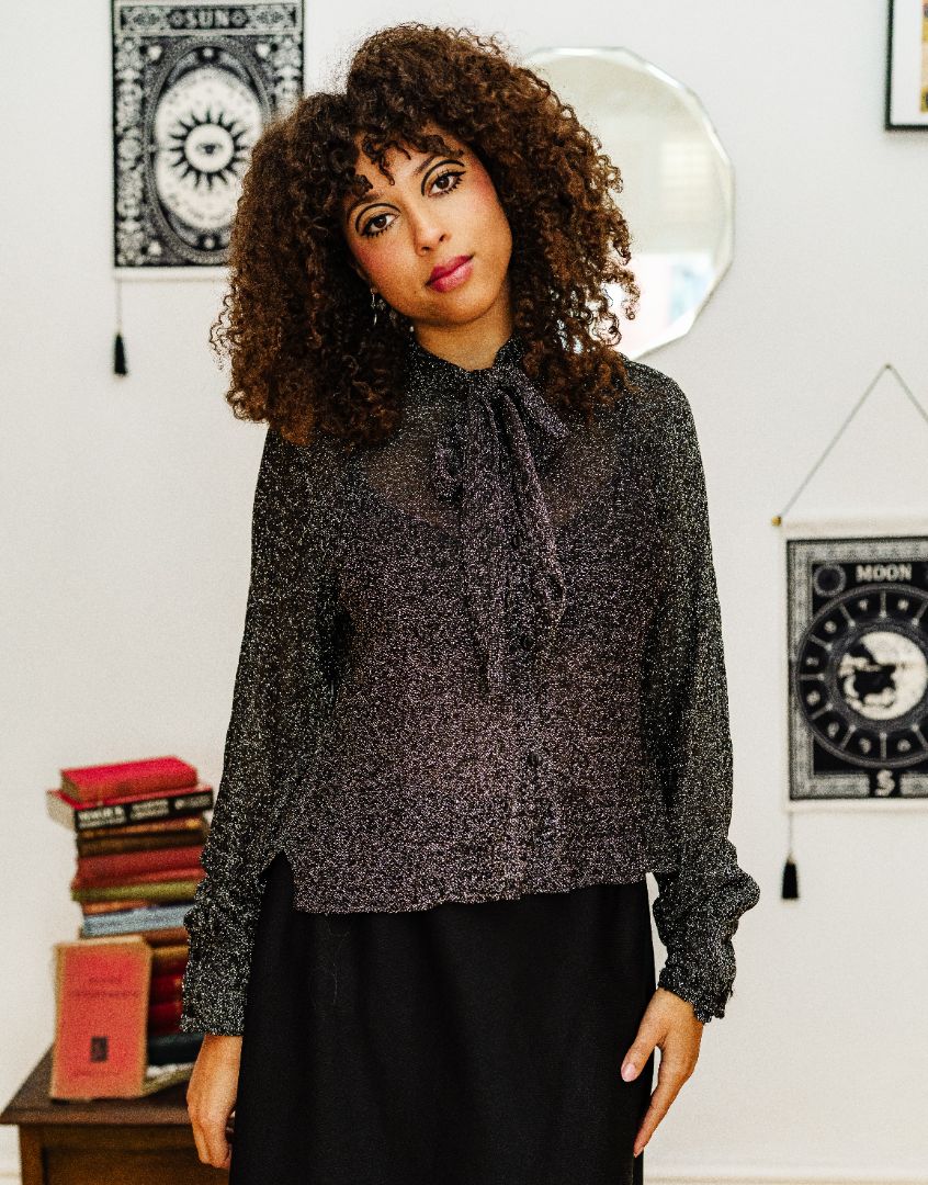 Details: 70s lurex is my absolute favourite, and this shirt will just elevate any outfit you put it with! In a dark silver, super sparkly lurex that will go with everything, this shirt has a slightly cropped length, buttons at the cuffs and of course a classic bow to tie at the neck.