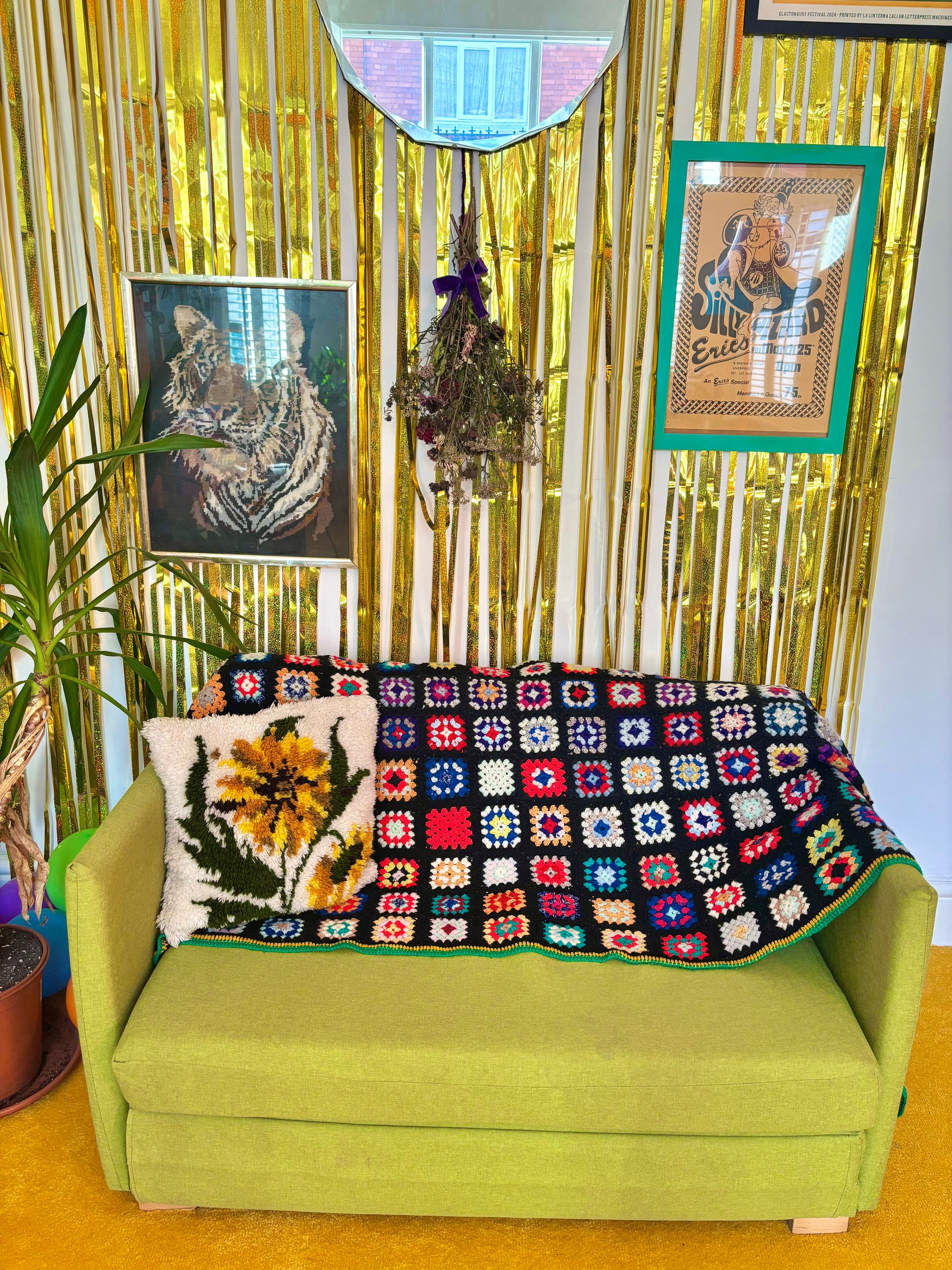 I am obsessed with granny squares and this blanket is perfect for adding a touch of cuddly vintage to any sofa or bed! Consisting of hundreds of small crochet granny squares, this blanket is made from a soft acrylic/wool blend and is SO colourful! In good condition.