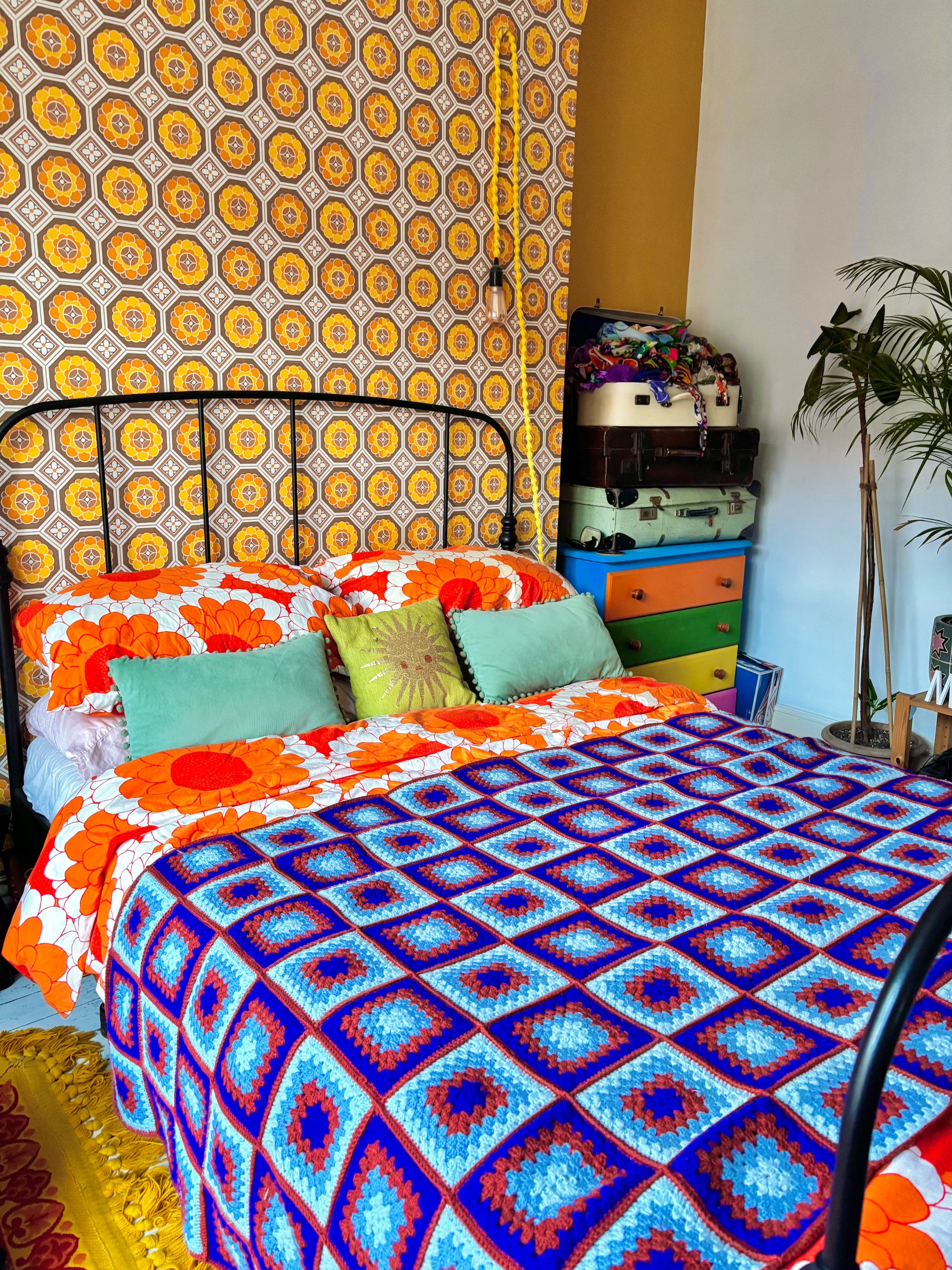 Blue and brown is such an underrated colour combo! Made up of gorgeously thick wool/acrylic granny squares, this blanket is super warm, and really long so perfect for a double bed. In good condition.